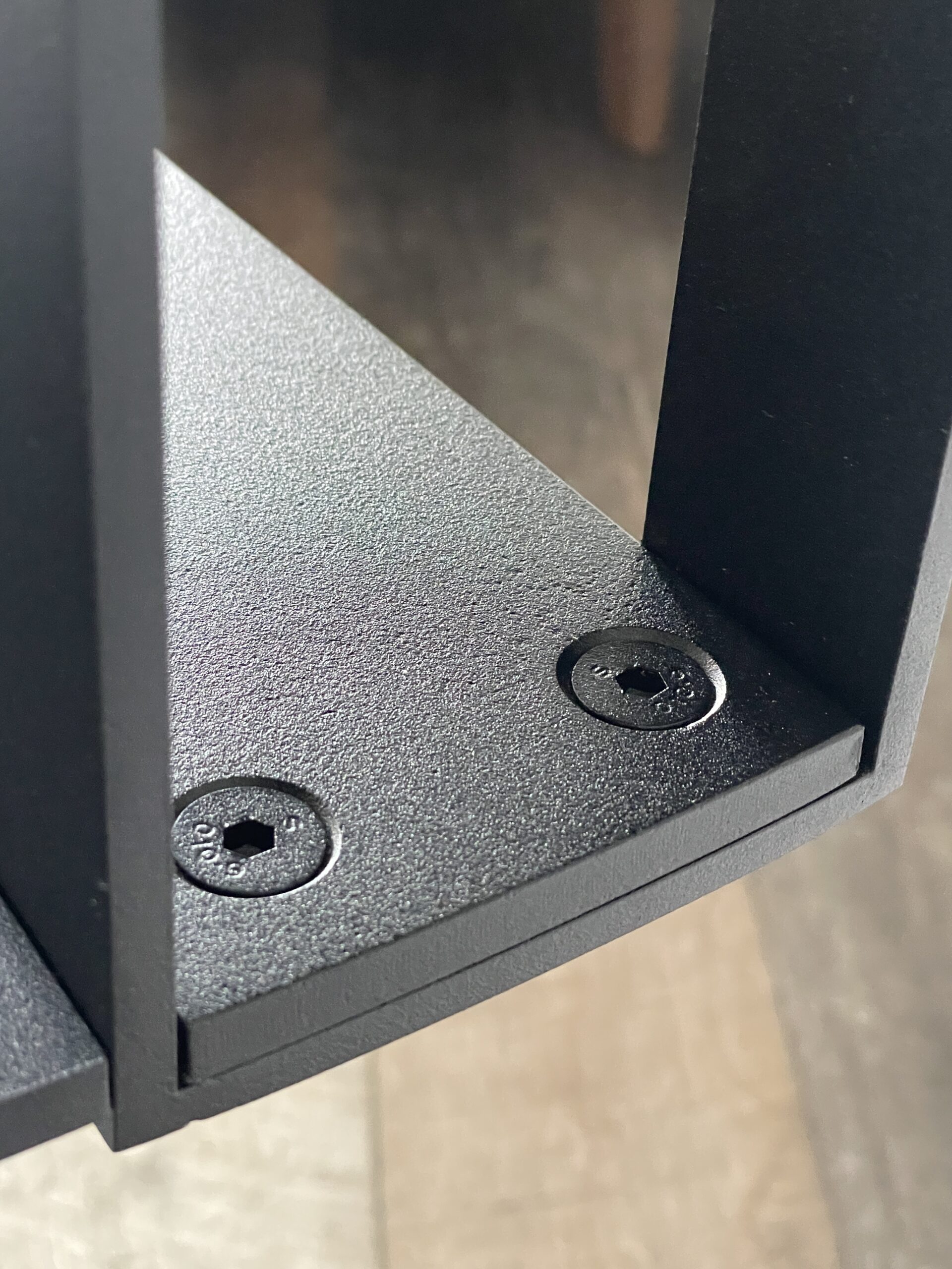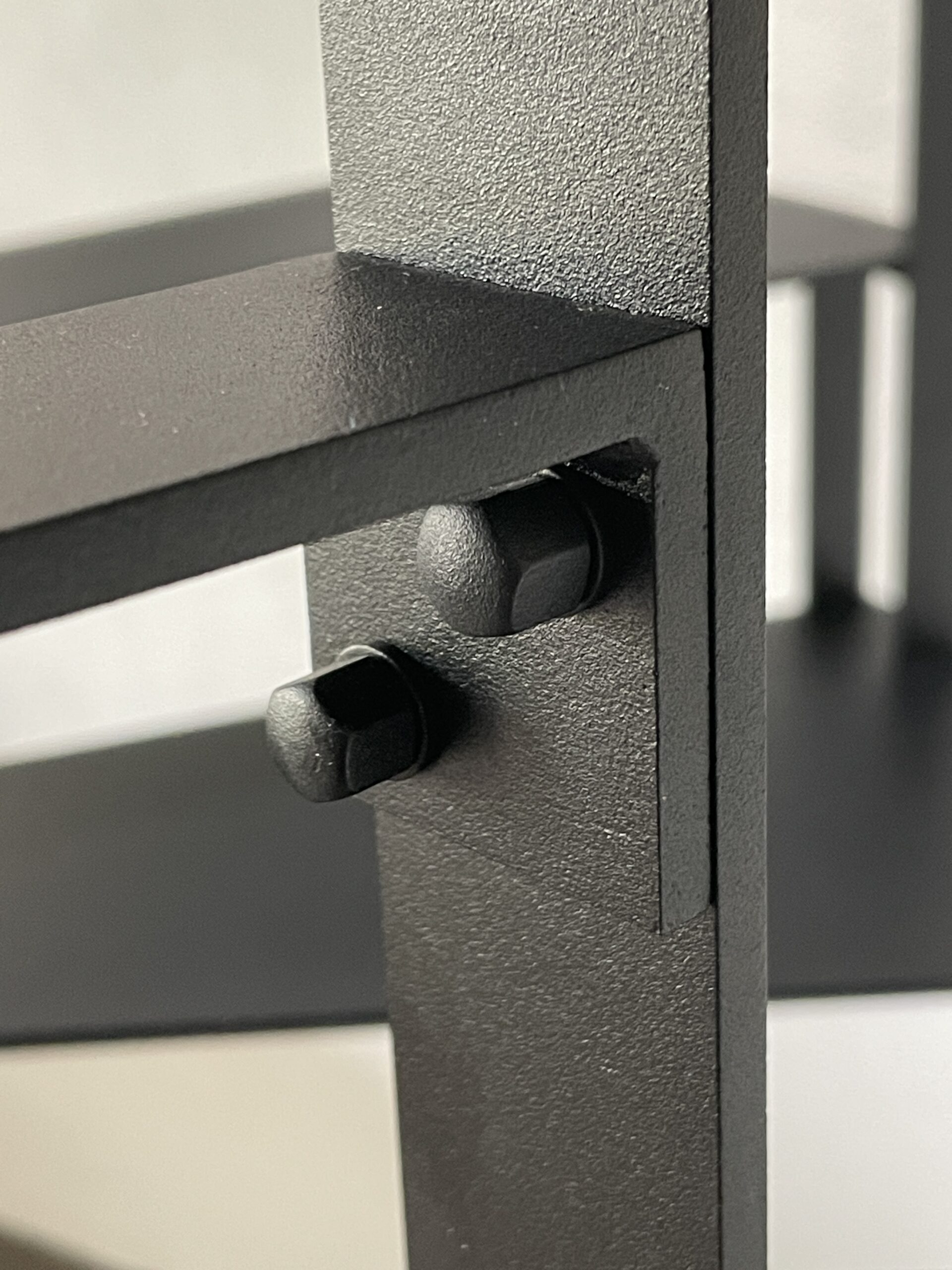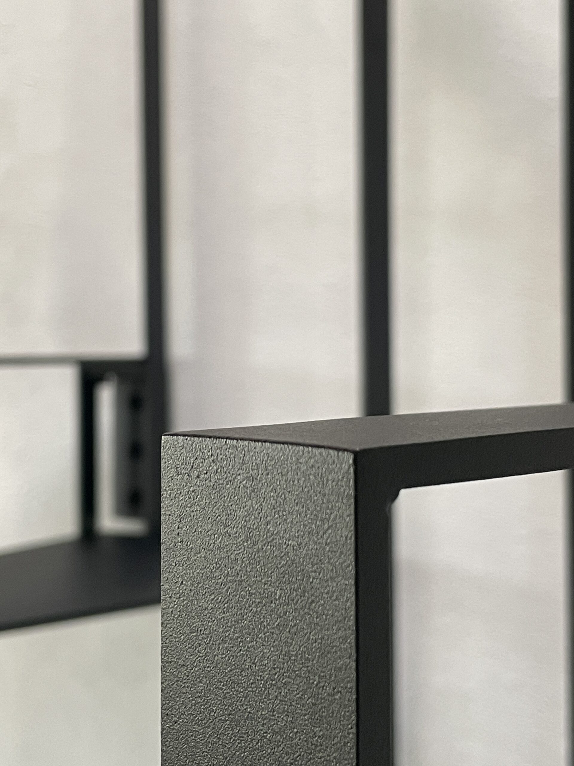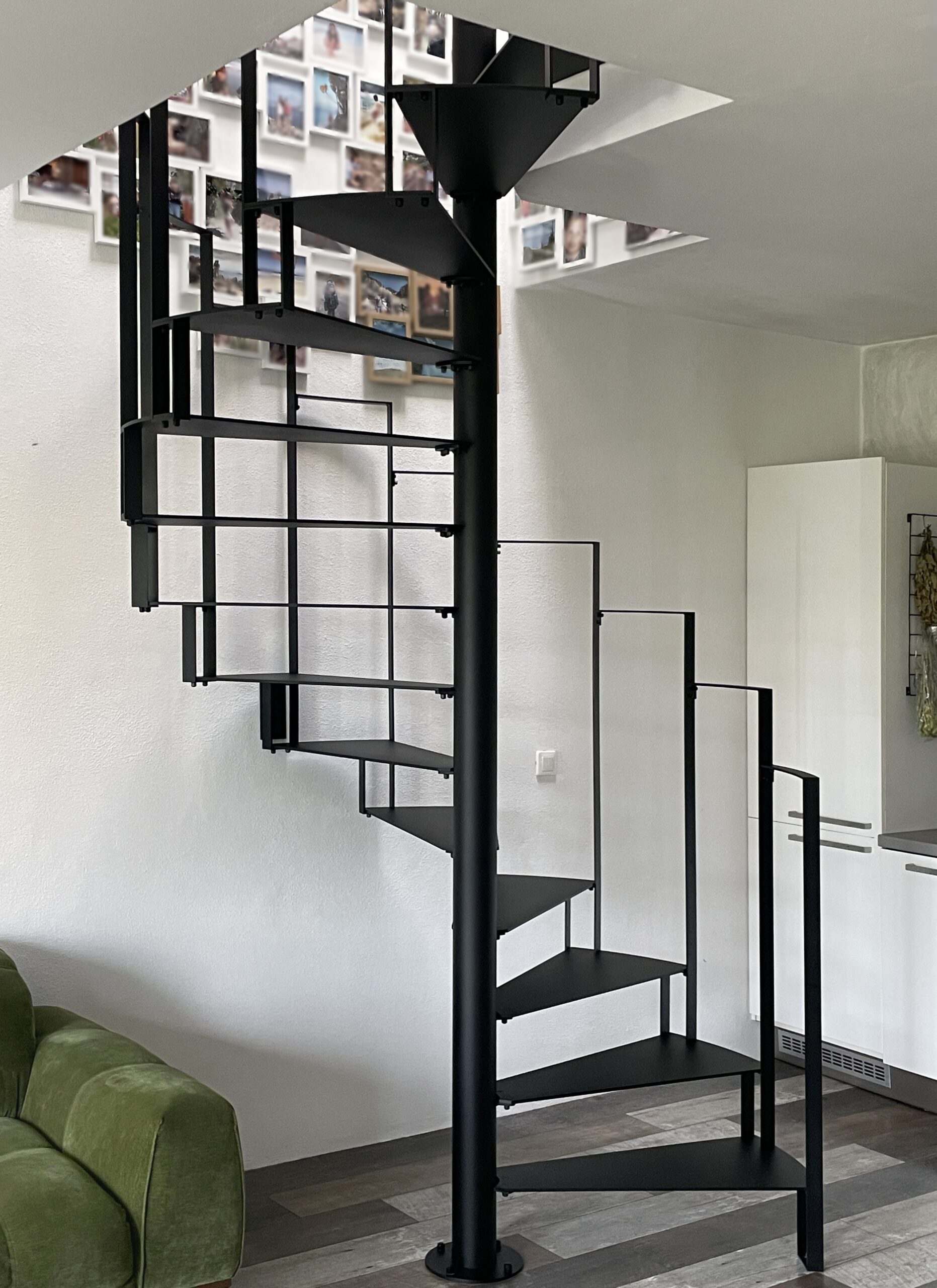 Moderní ocelové točité schodiště s minimalistickým designem, které kombinuje precizní řemeslné zpracování a elegantní černý povrch. Schodiště je navrženo jako výrazný interiérový prvek, který šetří prostor a dodává místnosti moderní industriální charakter.
